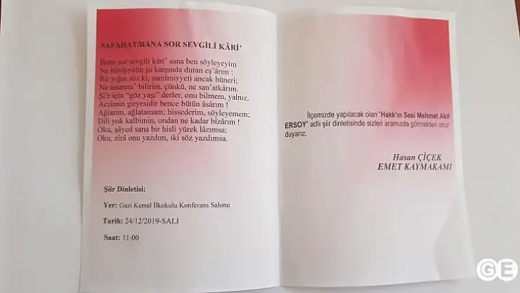 Emet ilçesinde Mehmet Akif Ersoy anma programları kapsmaında 24 Aralık Salı günü Gazi Kemal İlkokulu salonunda bir şiir dinletisi düzenlenecek. Programda yine ilçe protokolü Mehmet Akif şiirleri seslendirecek.